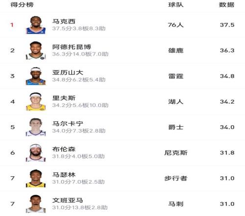 说实话,不看结果很难想象,还有谁能在场均得分上力压字母哥和亚历山大,结果真有。他就是76人的马克西,因为乔治受伤、恩比德下滑,马克西不得不扛起球队进攻大旗,过去4场比赛,他场均上场43分钟,得到37.5分3.8篮板8.5助攻,命中率45.5%,场均命中4.5记三分,三分球命中率47.4%,帮助球队4胜0负。马克西这赛季虽然没拿50+,但已经有了2场40+,对于上面的排名,你认为谁最终能拿下本赛季的得分王呢?