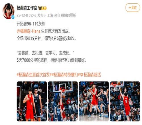 赛后,杨瀚森工作室晒出多张照片并发文:“去尝试,去犯错,去学习,去成长。”5天7000公里的旅程,相信你已努力做到最好。