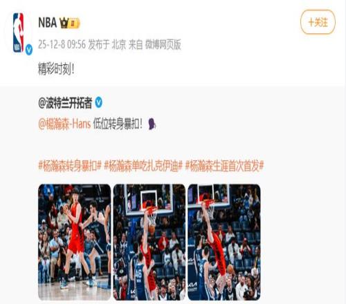 波特兰开拓者队官方微博晒出其低位转身暴扣照,NBA官方转发并发文称“精彩时刻”。